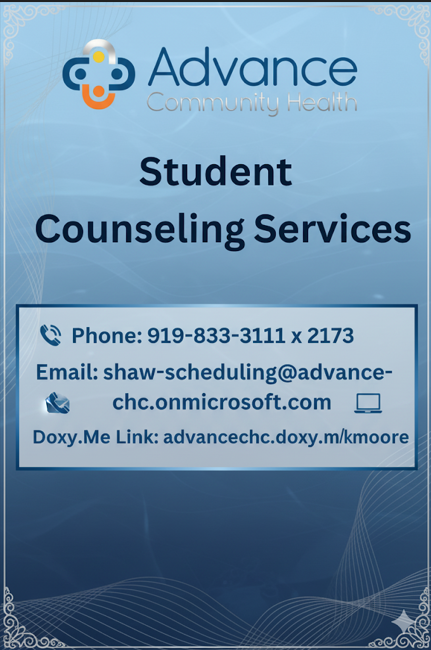 Your mental health matters and we’re here for you! If you ever feel stressed, overwhelmed, or just need someone to talk to, support is only a call or a click away. You can set up a face-to-face or virtual therapy session that works best for you:📞 Phone: 919-833-3111 x 2173